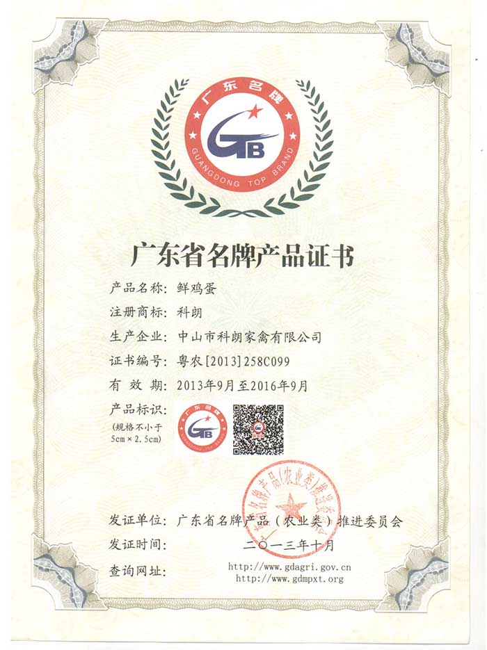 在广东省名牌推进委员会组织的2013年度广东省名牌评选活动中,科朗鲜蛋喜获“广东省名牌产品”荣誉称号。这也是科朗鲜蛋继被评为“无公害农产品”之后获得的又一项重要荣誉,它标志着科朗品牌建设又上了一个新台阶。